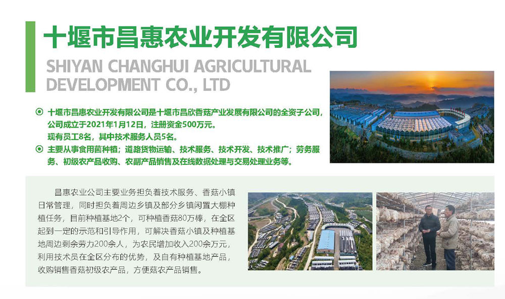 十堰市昌惠農(nóng)業(yè)開發(fā)有限公司是十堰市昌欣香菇產(chǎn)業(yè)發(fā)展有限公司全資子公司,公司成立于2021年1月12日,注冊資金500萬元,現(xiàn)有員工8名員工,其中技術(shù)服務(wù)人員5名,主要從事食用菌種植;道路貨物運輸、技術(shù)服務(wù)、技術(shù)開發(fā)、技術(shù)推廣;勞務(wù)服務(wù)、初級農(nóng)產(chǎn)品收購、農(nóng)副產(chǎn)品銷售及在線數(shù)據(jù)處理與交易處理業(yè)務(wù)等。公司圍繞區(qū)委、區(qū)政府在全區(qū)大力發(fā)展香菇產(chǎn)業(yè),壯大集體經(jīng)濟,把香菇產(chǎn)業(yè)作為鄉(xiāng)村振興的主導產(chǎn)業(yè),農(nóng)民致富支柱產(chǎn)業(yè)這一主線開展工作。對全區(qū)現(xiàn)有鄉(xiāng)鎮(zhèn)制棒廠設(shè)備設(shè)施進行管護、維護;承擔香菇小鎮(zhèn)1200余畝香菇產(chǎn)業(yè)園全方位管理責任;對全區(qū)范圍內(nèi)香菇基地閑置空棚有選擇性的種植經(jīng)營,在全區(qū)起到一定的示范和引導作用,公司利用技術(shù)員在全區(qū)分布的優(yōu)勢,收購銷售香菇初級農(nóng)產(chǎn)品,解決菇農(nóng)種植中遇到的所有難題的同時,利用好的資源和平臺來提高鄖陽香菇知名度,讓全國更多的人了解到它的出處及它自身營養(yǎng)價值。